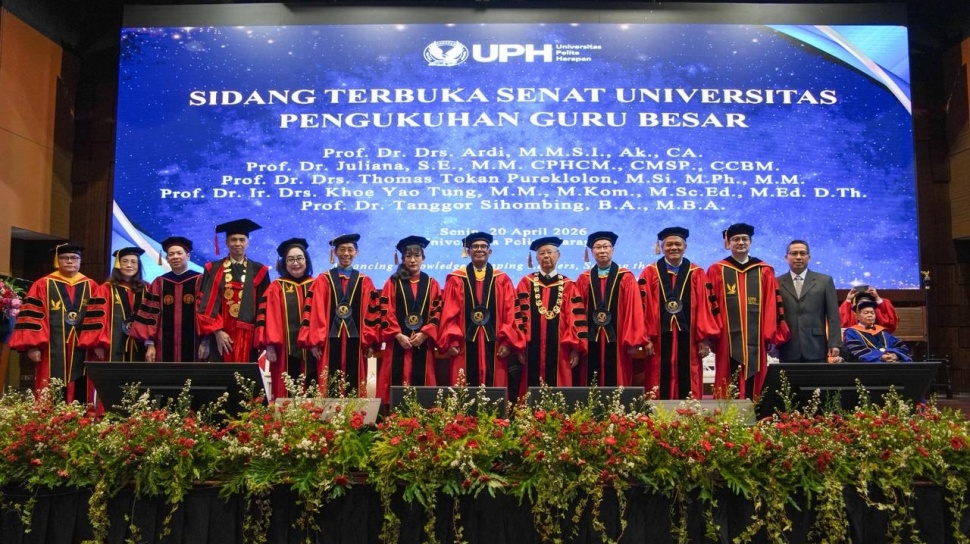 SuaraBanten.id - Universitas Pelita Harapan (UPH) menegaskan komitmennya dalam menghadirkan pendidikan tinggi yang unggul dan berdampak melalui Sidang Terbuka Upacara Pengukuhan Lima Guru Besar dari berbagai disiplin ilmu. Hal ini sekaligus menunjukan perkembangan kompetensi dan kualitas akademisi UPH. Pengukuhan para Guru Besar berlangsung pada 20 April 2026 di Auditorium Grand Chapel, Kampus Utama UPH Lippo Village, Tangerang.